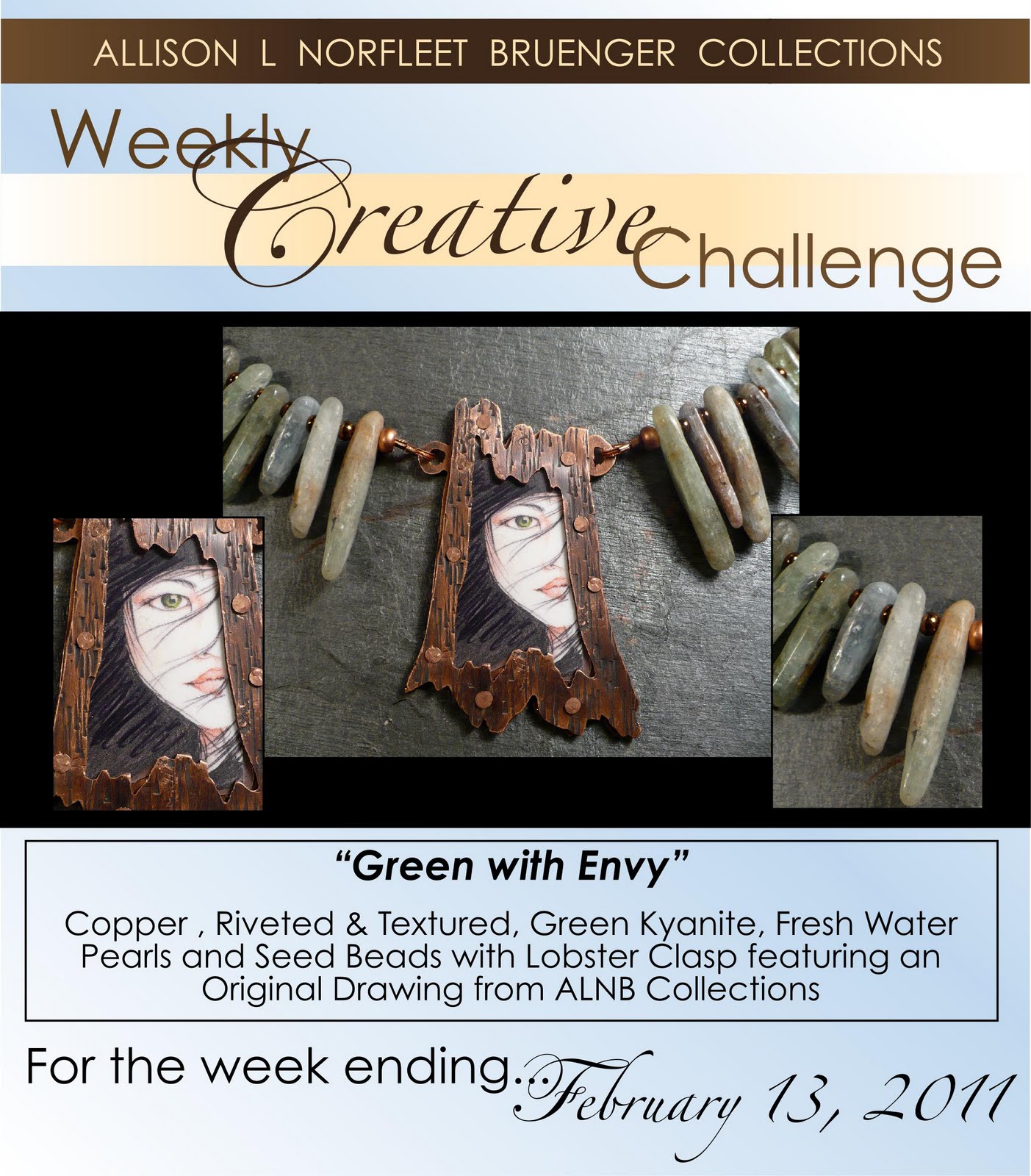 Well this weeks entry is a fun twists on envy and the color "green". Green is one of my favorite colors and this green eyed beauty can cause a little envy in us all. I love the green kyanite sticks and how they pull her eye color out just so. This piece was fun to work on and I hope you all enjoy it as well.